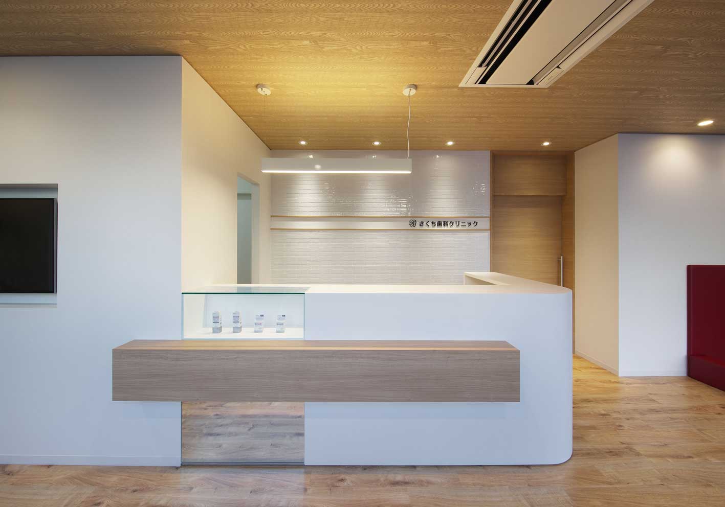 白を基調とした明るい空間に、木のぬくもりをプラスした受付デザイン。