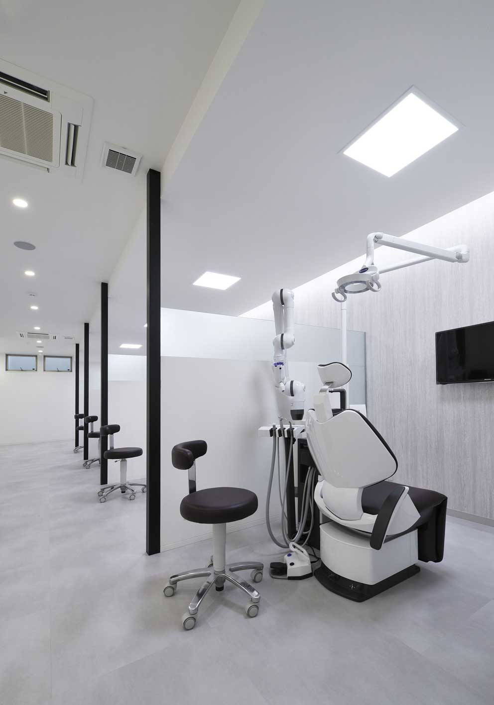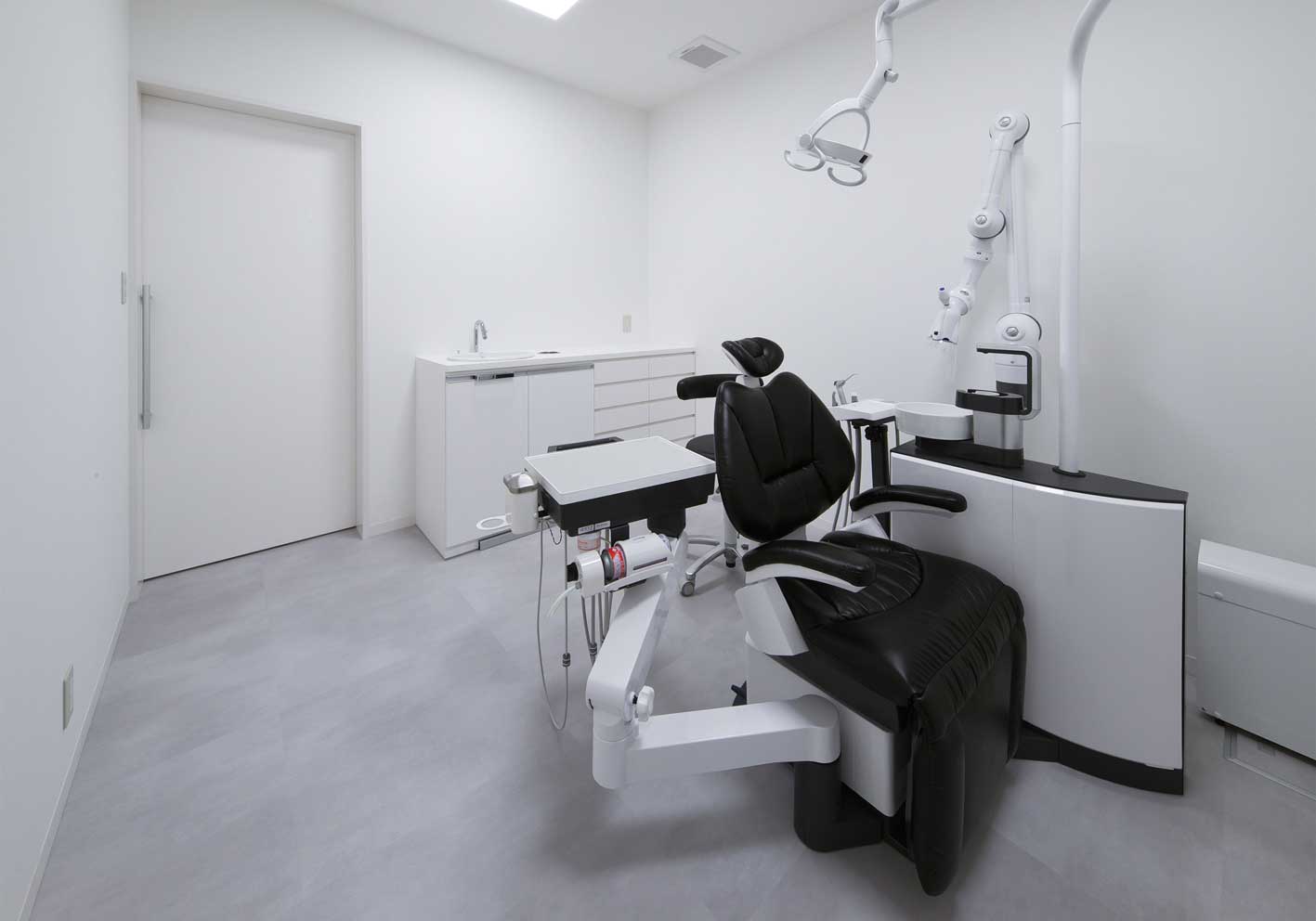 一方で診療室は、モノトーンを基調にしたクリーンで機能的な空間。衛生的な印象とともに、精密な診療を支える静謐な雰囲気を持たせています。