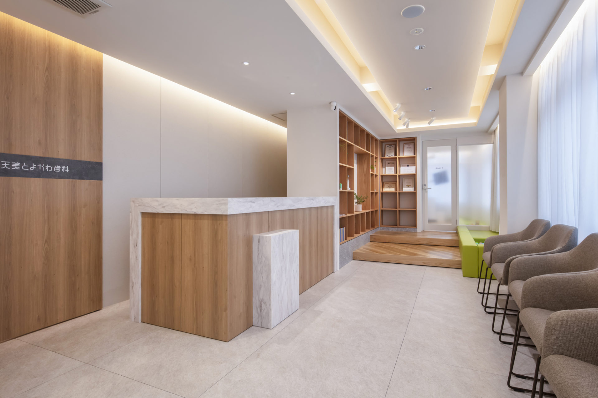 幼児から高齢者まで,将来的には矯正等保険外診療なども含め幅広い診療に対応するクリニック。今回はテナントの2/3程を使用し、幅広い年代に対応した一般診療エリアの設計となった。①スタッフと患者の動線をなるべく分離する②診察に対する緊張が解れる雰囲気づくり③3Fという視認性の悪さに考慮したデザイン。