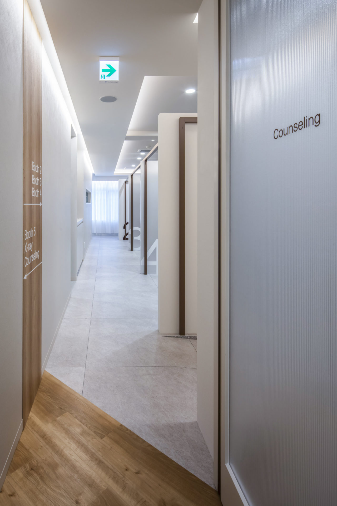 受付から診療室へと続く動線には、木質と間接照明を組み合わせた柔らかな光環境を採用。素材は受付と統一し、木の温もりと石調の質感を織り交ぜることで、クリニック全体に一体感を持たせている。清潔さと落ち着きを両立しながら、患者が安心して歩を進められるアプローチ空間を目指した。