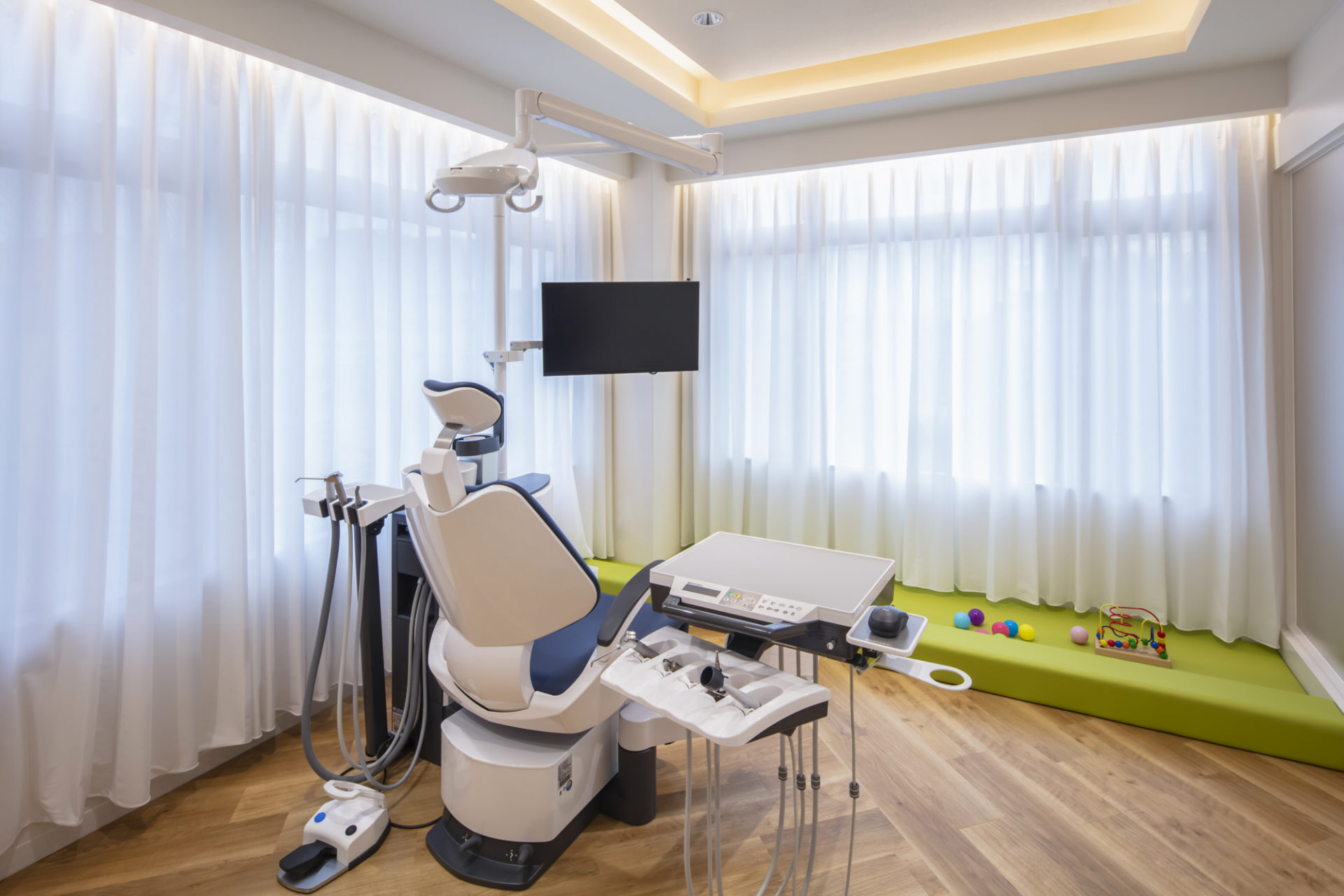 窓際にはやわらかなグリーンのクッションスペースを設け、小さなお子さまが安心して過ごせるキッズエリアを併設。医療機能と家庭的なやさしさを融合させた、“家族で通える歯科クリニック”を目指した設計です。